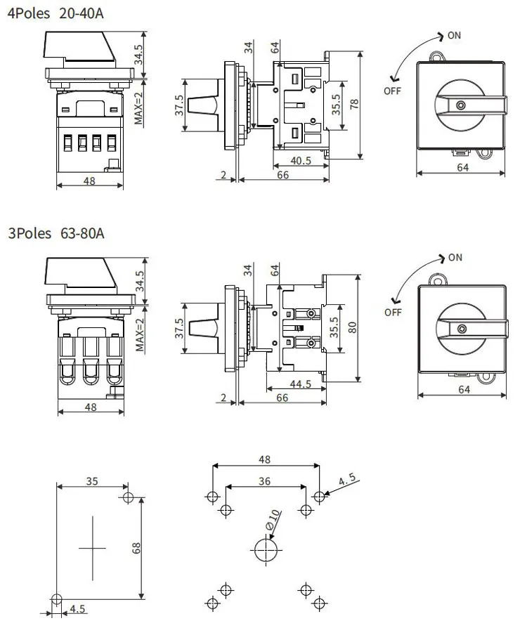 AC Interruptor aislado 4P Entrada: 80A Mango negro pequeño |