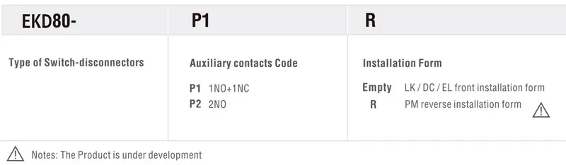 | Tipo de interruptores-seccionadores | Formulario de instalación Instalación de rieles DB Montaje en panel PM Instalación de cerradura de puerta de CC EL Cajas de plástico externas Caja exterior de aluminio ELA | Corriente nominal (A) 16 16A (marco de 40) 20 20A (marco de 40) 25 25A (marco de 40) 32 32A (marco 40) 40 40A (marco 40) 63 63A (marco 80) 80 80A (marco 80) 80H 100A (marco 80) 100 100A (marco de 125) 125 125A (marco 125) | Formulario de bloqueo Vacío Sin cerradura R Con cerradura | Polacos 2 2P 3 3P 4 4P 5 5P 6 6P 7 7P 8 8P | Opción Handel RY Mango giratorio rojo/amarillo Solo con cerradura Mango giratorio BW negro/blanco Opcional con cerradura/sin cerradura BB Mango giratorio negro/negro Solo sin cerradura |
