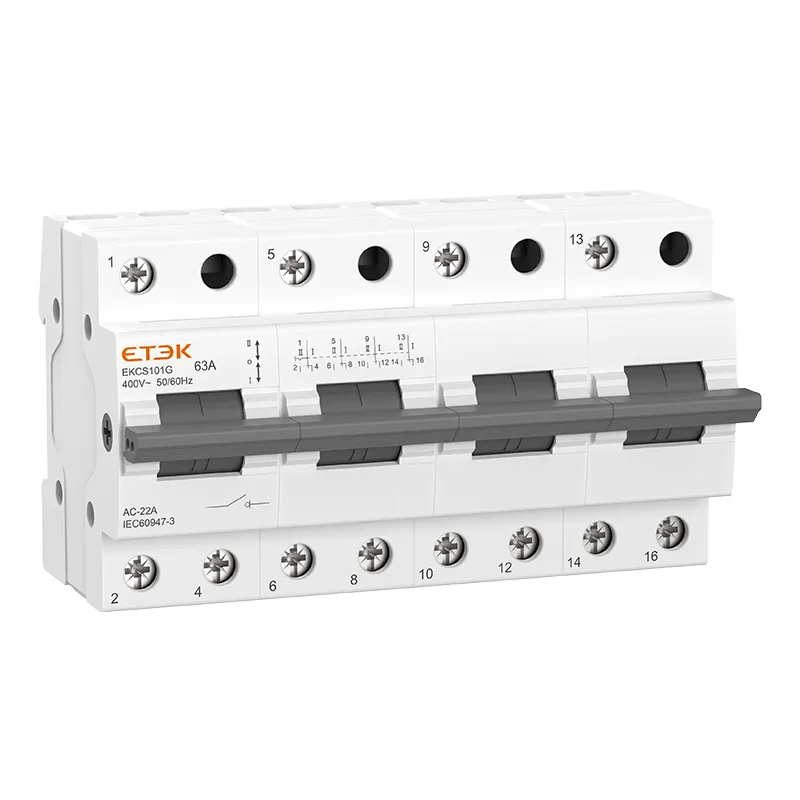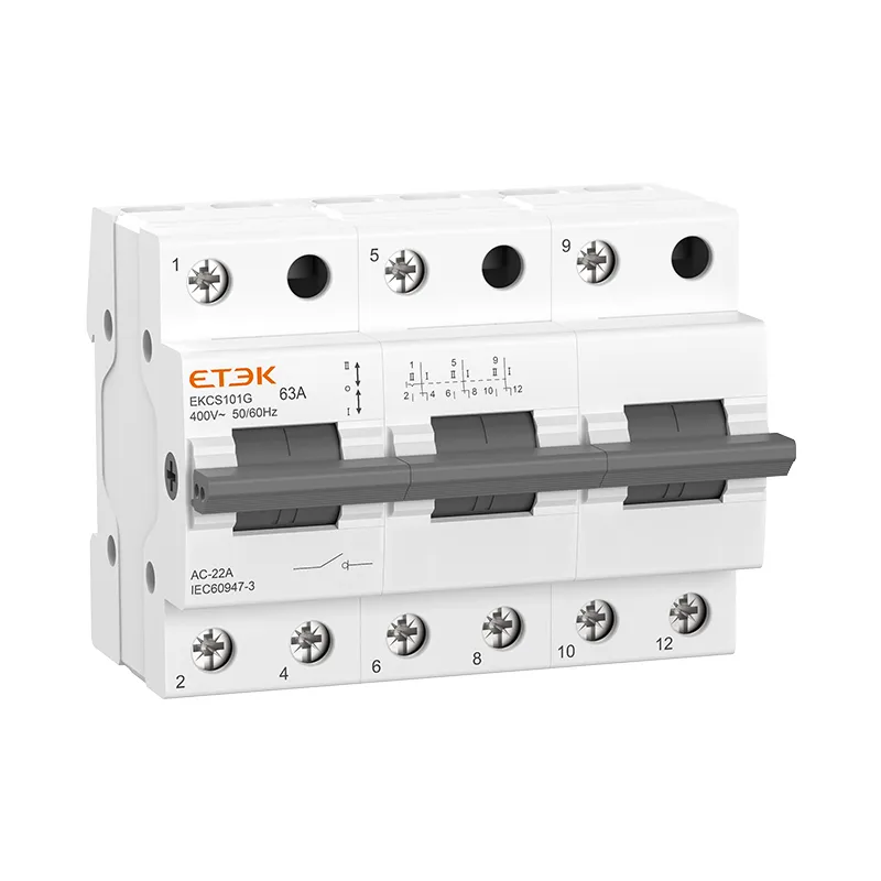 El interruptor de aislamiento de conversión de potencia dual montado en riel EKCS101G tiene cuatro funciones de encendido, apagado, conversión y aislamiento. Se puede encender y apagar libremente entre dos cargas transportadas por un grupo de líneas o en dos fuentes de energía. Se utiliza para encender y apagar y conmutar entre, utilizando la instalación en riel estándar DIN (35 × 7,5), la carcasa está hecha de moldeo por inyección PA66, con un alto rendimiento ignífugo, es un producto ideal que debe usarse para conmutar y abrir y cerrar en equipos y circuitos industriales. La corriente máxima puede alcanzar los 125 A, y es conveniente y seguro de instalar y cablear en el riel guía.