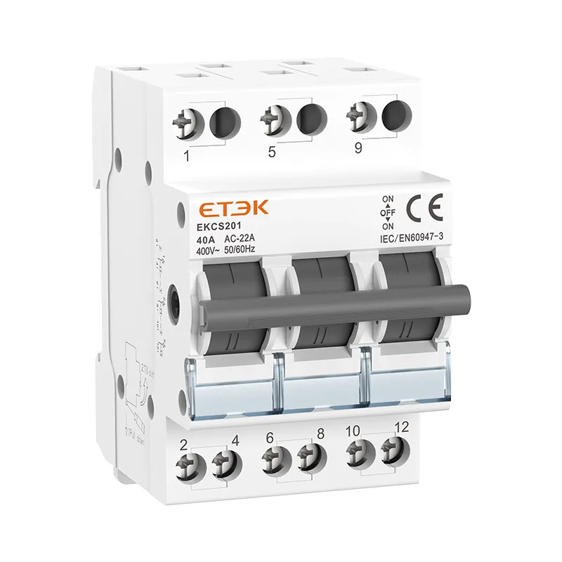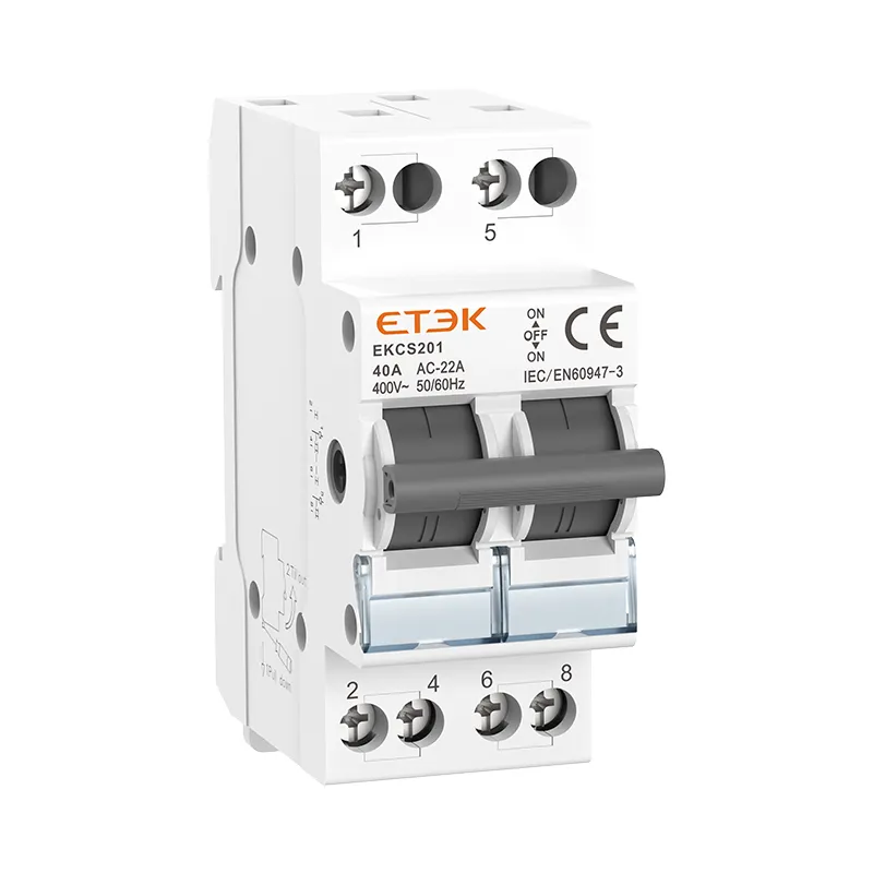 El interruptor de aislamiento de conversión de potencia dual montado en riel EKCS201 tiene cuatro funciones de encendido, apagado, conversión y aislamiento. Se puede encender y apagar libremente entre dos cargas transportadas por un grupo de líneas o en dos fuentes de energía. Se utiliza para encender y apagar y conmutar entre, utilizando la instalación en riel estándar DIN (35 × 7,5), la carcasa está hecha de moldeo por inyección PA66, con un alto rendimiento ignífugo, es un producto ideal que debe usarse para conmutar y abrir y cerrar en equipos y circuitos industriales. La corriente máxima puede alcanzar los 40 A, y es conveniente y seguro de instalar y cablear en el riel guía.