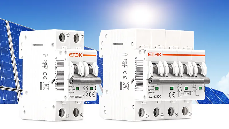 La tensión de trabajo nominal de los disyuntores de CC de la serie EKM1-63DC que se utilizan especialmente en la energía fotovoltaica puede alcanzar los 1000 V CC. El sistema especial de extinción de arco y limitación de corriente puede desconectar rápidamente la corriente de falla del sistema de distribución de energía de CC. El módulo fotovoltaico, un componente importante en el sistema de energía solar, puede evitar daños causados por la alta corriente inversa de CC y la corriente de retroalimentación de CA causada por la falla del inversor, lo que garantiza un funcionamiento confiable del sistema solar fotovoltaico.
