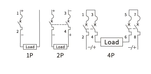 | Tensión nominal (Ue) | 1P (250 VCC), 2P (500 VCC), 4P (1000 VCC) |