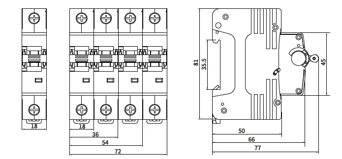 ● Tensión nominal: 1P (250 VCC), 2P (500 VCC), 4P (1000 VCC)