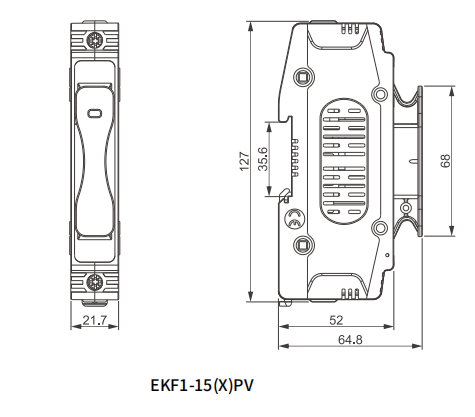 EKF1-15PV es un portafusibles de CC diseñado para la protección de cadenas fotovoltaicas contra cortocircuitos y sobrecargas. Tiene una tensión de trabajo nominal de 1500 V CC y una corriente de trabajo máxima de 50 A. Se instala de forma segura mediante un riel DIN estándar de 35 mm para una compatibilidad y estabilidad óptimas.