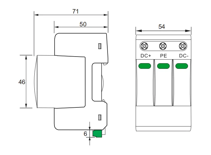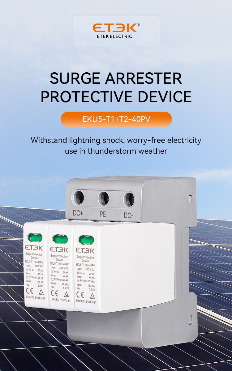 El dispositivo de protección contra sobretensiones fotovoltaicas (SPD) de tres módulos CC ETEK EKU5 Clase I + II (T1+T2) (con dispositivo de conmutación de CC de tres pasos) presenta indicación visual y señalización de contacto remoto opcional (contacto de conmutación flotante) para uso en sistemas fotovoltaicos.