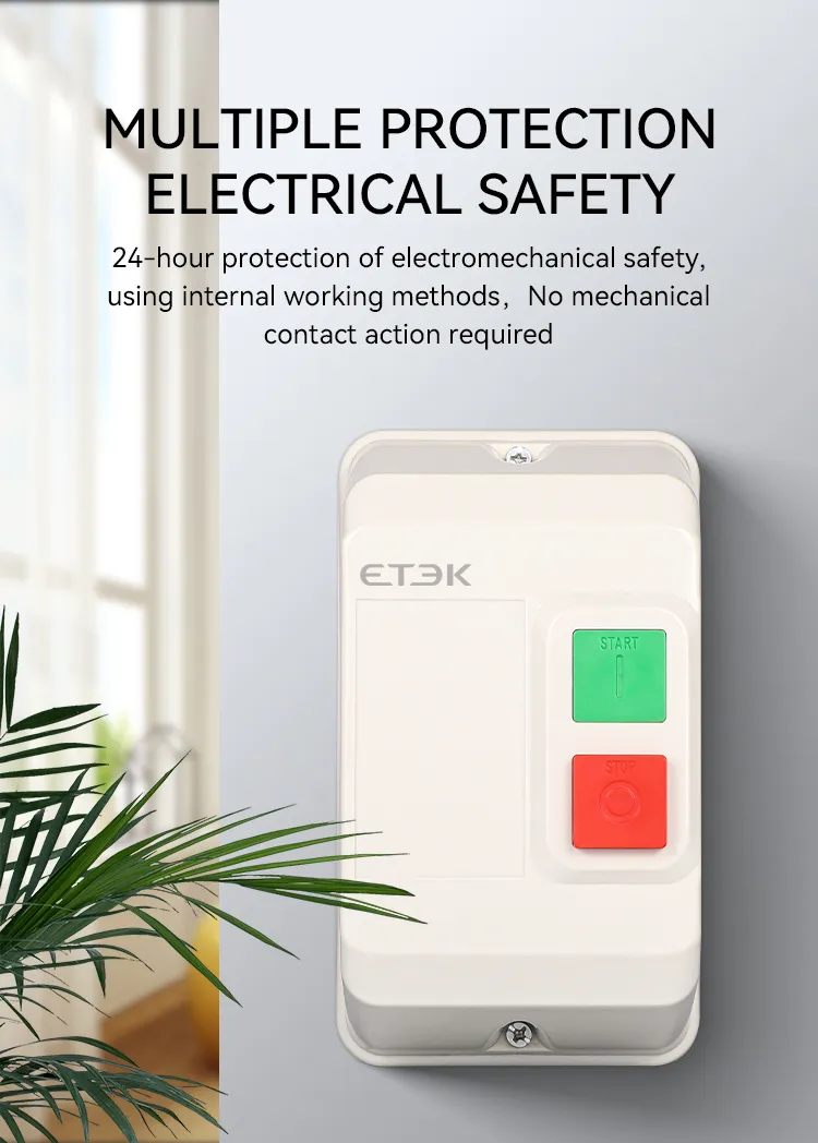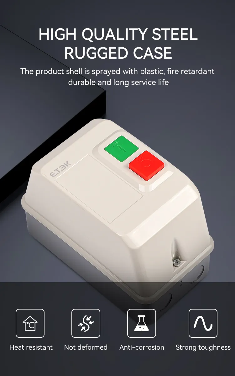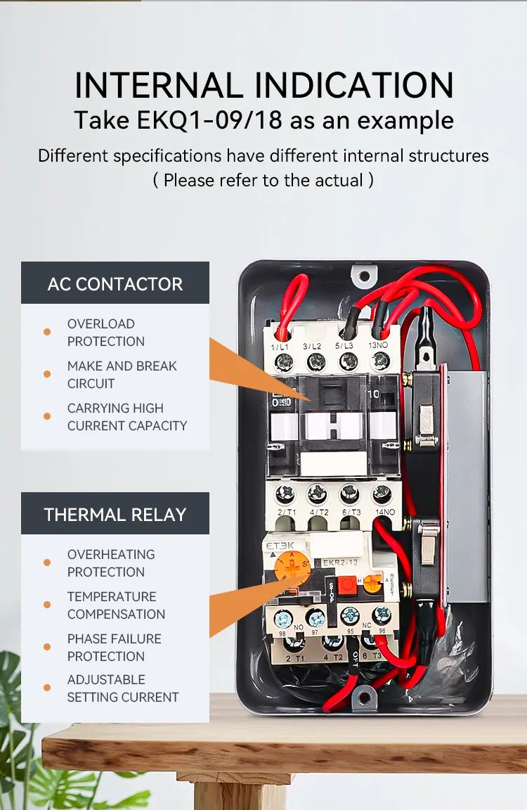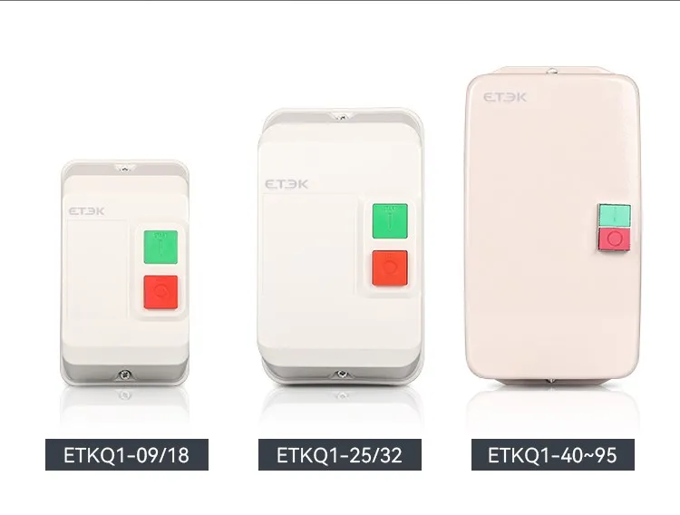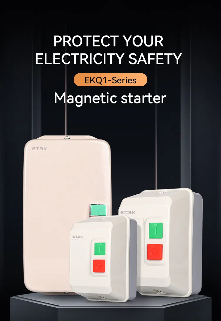 El arrancador electromagnético de la serie EKQ1 ("arrancador" para abreviar en adelante) se utiliza para controlar la apertura o cierre del contactor mediante una combinación de señal externa y relé térmico e instalado en la misma caja de metal, las señales del interruptor externo para controlar de acuerdo con el dispositivo de contacto conectado y los puntos para romper, se aplica principalmente al circuito con corriente CA de 50 Hz (o 60 Hz), voltaje operativo nominal de 660 V y potencia controlada nominal de hasta 45 kW (corriente de hasta 95 A) para usar para controlar el arranque y la parada directos del electromotor para proteger el motor de sobrecarga y falla de fase.