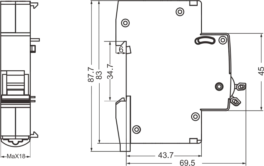 2. Para montar en el lado izquierdo del MCB/RCBO gracias al pasador especial.