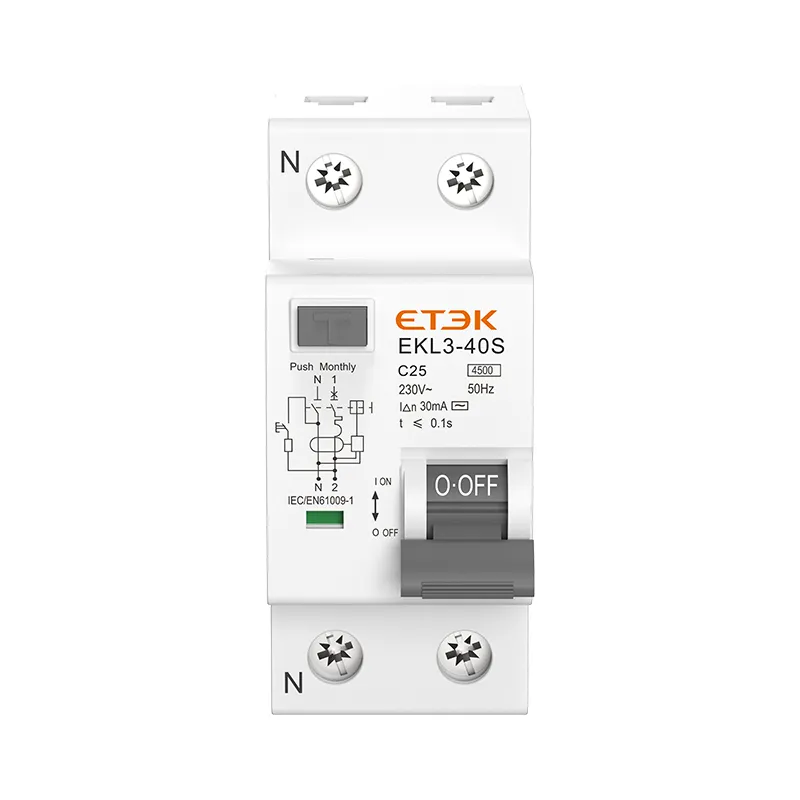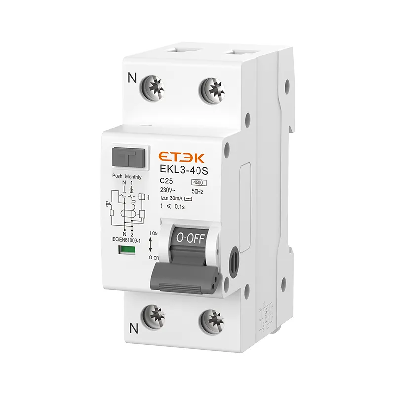 El disyuntor de corriente residual EKL3-40S de 4,5 kA fabricado por ETEK Electric puede proteger su equipo contra sobrecargas dañinas y corrientes de fuga. La carcasa termoplástica de la unidad es resistente a los impactos y proporciona aislamiento para protegerlo de descargas eléctricas. Ofrece una característica de disparo de tipo B o C.