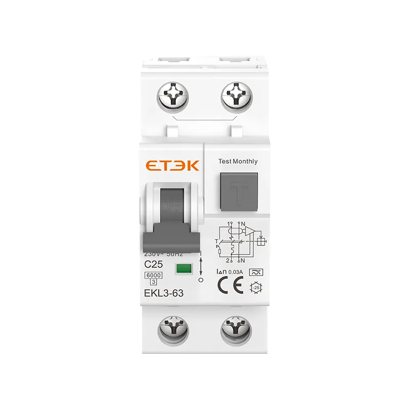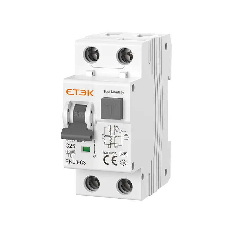 El disyuntor de protección EKL3-63 "Fase + neutro + fuga" se aplica al circuito residencial monofásico de 50 Hz o 60 Hz, voltaje nominal de 230 V, para proteger contra fugas, sobrecarga eléctrica civil y cortocircuito. El producto cuenta con muchas ventajas, como tamaño pequeño, alta capacidad de corte, corte de línea cero, línea activa al mismo tiempo y protección contra fugas en caso de cableado inverso de línea activa. Este producto cumple con las normas IEC61009, con tecnología internacional avanzada.