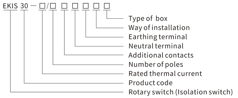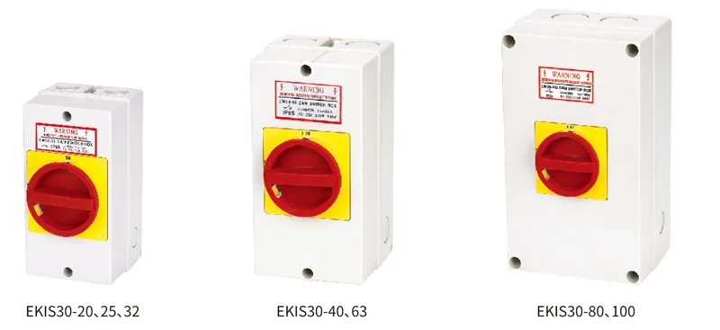 ● Los interruptores rotativos de la serie EKIS30 tienen 7 clasificaciones de corriente: 20 A, 25 A, 32 A, 40 A, 63 A, 80 A y 100 A.