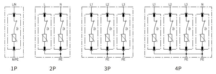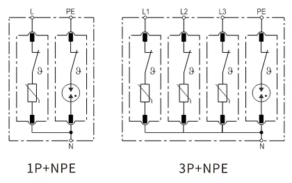 El módulo N-PE y el módulo LN realizan una distinción mecánica para evitar combinaciones incorrectas de módulos SPD enchufables y los conectores cumplen con las disposiciones pertinentes del apartado 7.3.1 de la norma IEC61643-11. Por ejemplo, el cartucho del modo N-PE (que consta de un tubo de descarga de gas) se puede enchufar en el modo LN (que consta de un varistor), lo que puede provocar situaciones peligrosas como el inicio de un incendio.