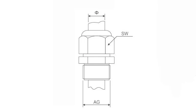 | Modelo | Tamaño de rosca (mm) | Tamaño del orificio AG (mm) | Longitud de la rosca (mm) | Espesor de pared (mm) | Cable aplicable Ф(mm) | Tamaño de llave SW (mm) |